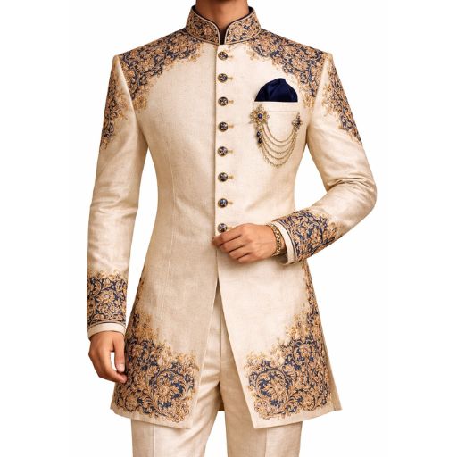 The premium-quality material ensures comfort throughout the day, while the detailed craftsmanship adds a luxurious touch. Whether paired with churidar, stole, or mojris, this sherwani delivers a sophisticated and majestic look ideal for grand celebrations.